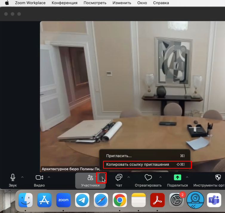 - Дальше нам нужно отправить ссылку на созданную нами конференцию. Для этого нажимаем треугольник на кнопке участники и нажимаем "Копировать ссылку приглашения"