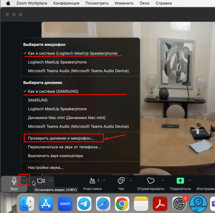 В открывшемся окне нажимаем на ТРЕУГОЛЬНИК возле кнопки звук - Проверяем, что настройки соответствуют (ПОДЧЕРКНУТО). Звук у нас идет с телевизора, микрофон мы используем с камеры Logitech. Далее нажимаем "Проверить динамик и микрофон"