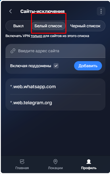 После этого ТОЛЬКО добавленные сайты должны идти через VPN