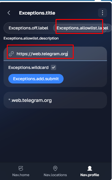 3. Выбираем то, что я выделил красным цветом и вставляем в строку тот сайт, который надо чтобы работал через VPN, НАПРИМЕР, https://web.telegram.org И СТАВИМ ГАЛКУ (Скопируем только основную часть ссылки (домен сайта), без всего, что идет после первого одинарного «/», например, нужный нам сайт это: https://web.telegram.org/a/#434133380 , а мы копируем только: https://web.telegram.org (аналогично и с другими сайтами) )