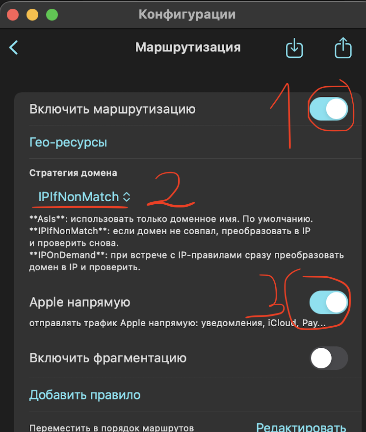 3. Включаем Маршрутизация (№1), выбираем из списка IpifNoMatch(№2), включаем "Apple напрямую"(№3)