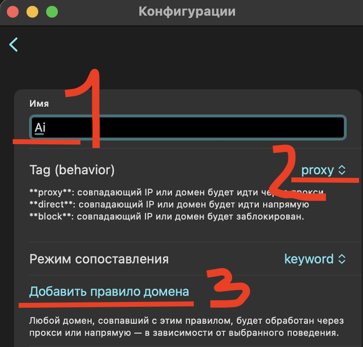 2. Вводим имя нашей настройки(№1), Выбираем подключение через Proxy(№2) и нажимаем на "Добавить правило домена"(№3) ( переключатель keyword оставляем по так)