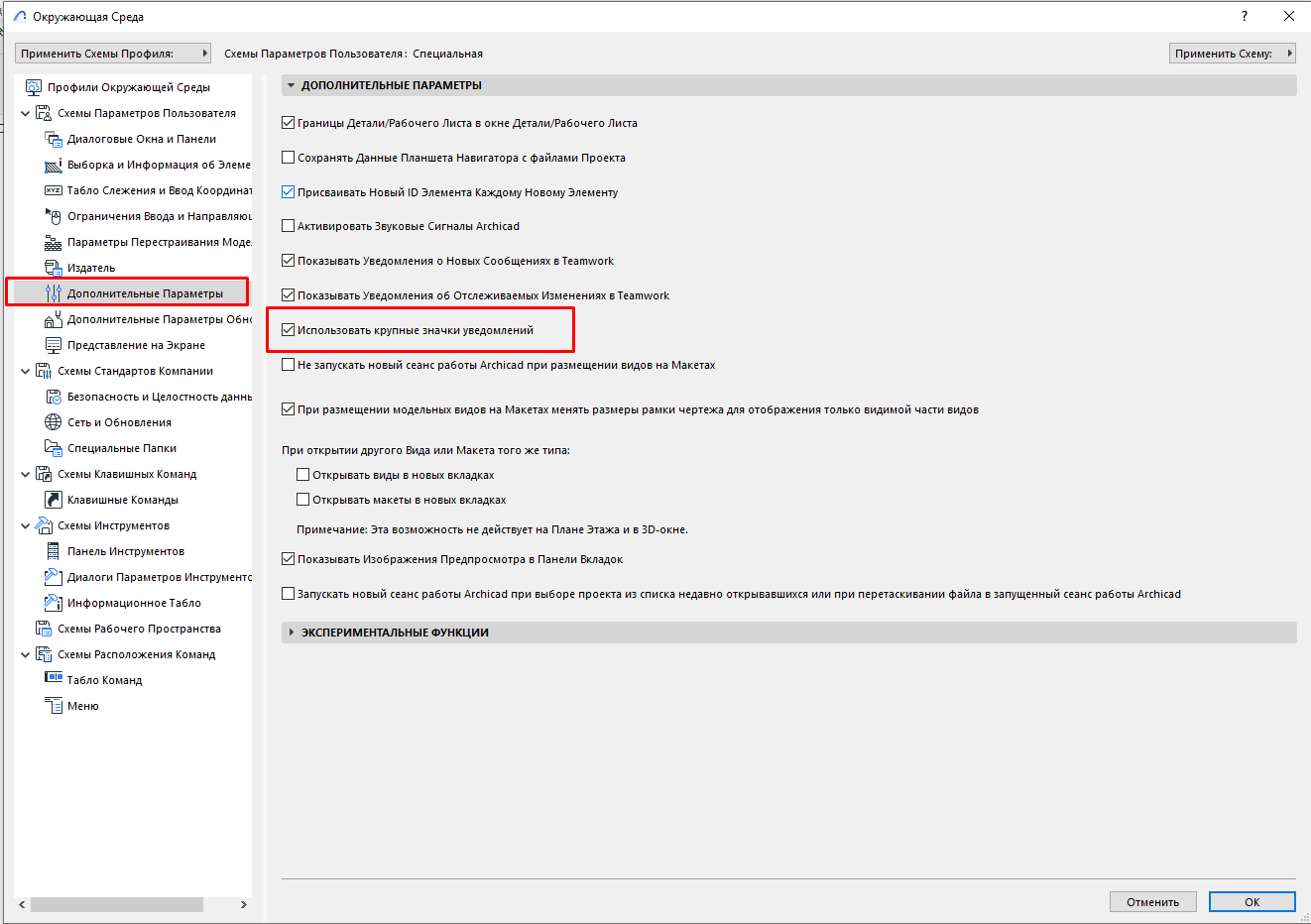 - Дальше слева выбираем "ДОПОЛНИТЕЛЬНЫЕ ПАРАМЕТРЫ" и ставим галочку возле "ИСПОЛЬЗОВАТЬ КРУПНЫЕ ЗНАЧКИ УВЕДОМЛЕНИЙ"
